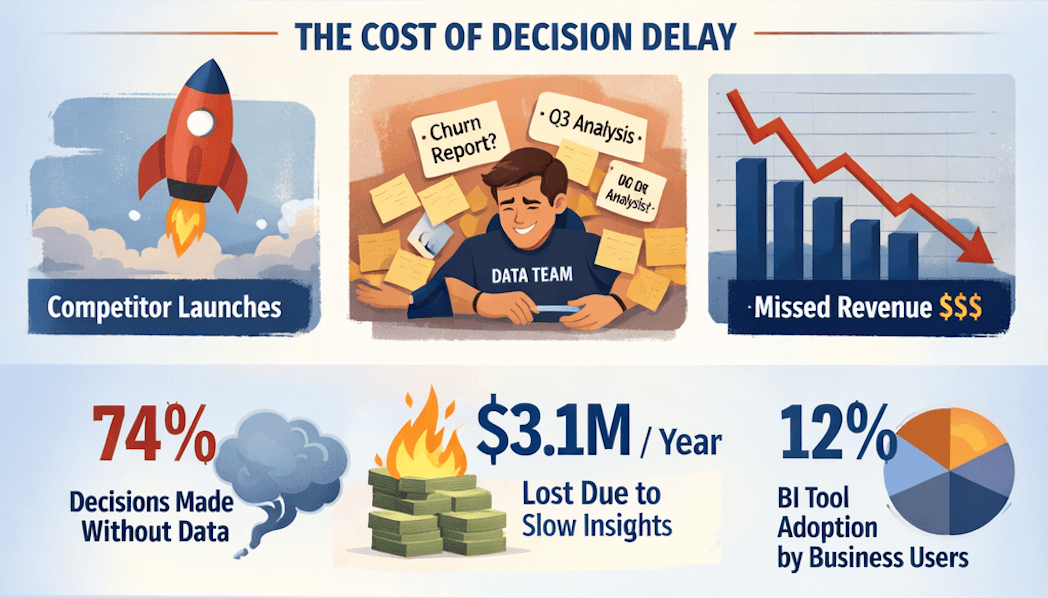 74% of executives say they make most decisions without the data they need | $3.1M average annual cost of poor data access at a 500-person SaaS company | 12% of BI tool licenses are actively used weekly by business users |