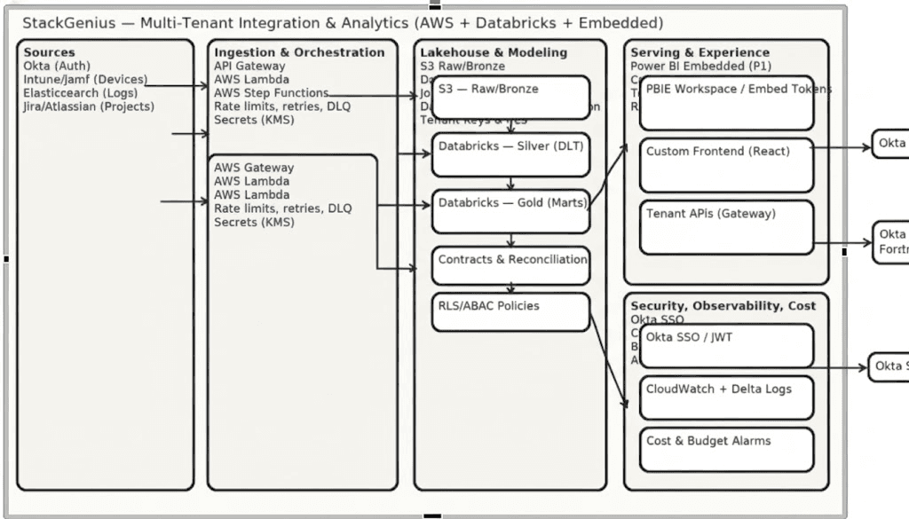 StackGenius partnered with a mid-sized US IT & Security company that managed multiple downstream tenants. The client was facing a critical challenge: their data sources—Okta, Intune, Jamf, Elasticsearch, and Jira/Atlassian—were siloed, making it difficult to get a unified view of tenant-level activity. Reporting was cumbersome, and each tenant required strict isolation while still maintaining a consistent user experience.